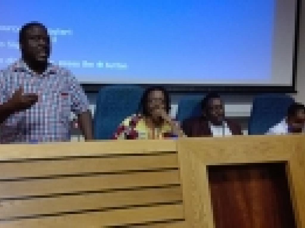 CAS Honorary Associate Dr Fani Ncapayi presents on 'Methodologies used to investigate the lives of residents in villages of the former Xhalanga district'. Rest of panel from left to right: Professor Simphiwe Sesanti of UNISA (Chair); Mr Giyose of CALUSA, who spoke on 'The Story of the Qhumanco'; and Dr Nomathamsanqa Tisani, who spoke on 'Of Definitions and Naming'.