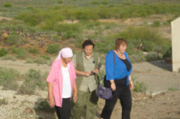 This tiny settlement near Verneukpan is absolutely unique. The adobe houses that form this dorpie, none of which has electricity, are spread over a wide area, around what used to be a school (closed not long ago for lack of pupils) and a somewhat dilapidated church. We stay here for several days, at the invitation of Magda Martiz, the extraordinary woman who runs the local kontantwinkel and who has allowed us to camp outside the kitchen attached to the shop. Never before in my life - not even on previous trips to these so appropriately named Cape Thirstlands - have I been so conscious of how much we take for granted the comforts of running water.