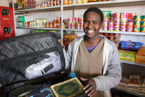 Shaafi Mohammed with his clothes and his Qur'an in the Somali shop where he works in Mamelodi
