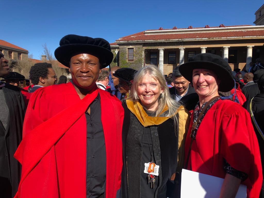 Prof Carolyn Hamilton with Dr Tebogo George Mahashe and Dr Erica de Greef at July Graduation Ceremony. Photo courtesy of Carolyn Hamilton.
