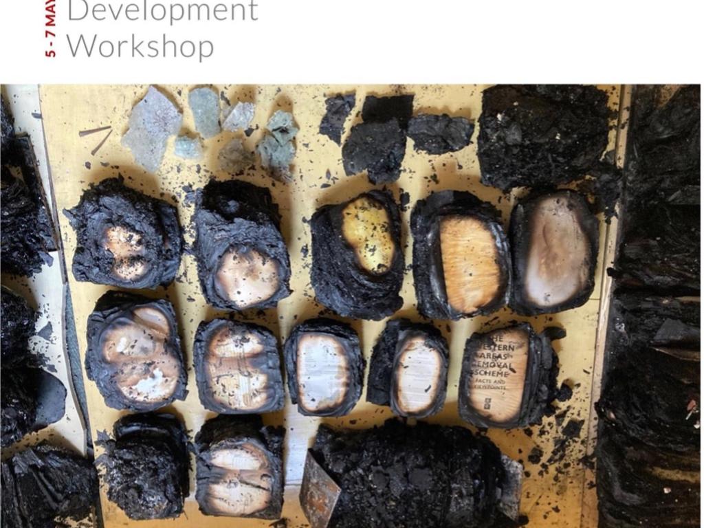 The APC’s first Research Development Workshop of 2021 took place from 5 to 7 May on Zoom, in the aftermath of the Table Mountain fire, and in the midst of efforts to salvage materials from the Jagger Library. The fire, and the questions it has since provoked about archives, loss, the transformation of collections, and scholarly obligations, would be inescapable for this workshop. Holding this in mind, the APC drew upon a photograph taken by APC associate researcher Jo-Anne Duggan of a series of charred remains of books from the collection, using it as a visual point of reference throughout the workshop.