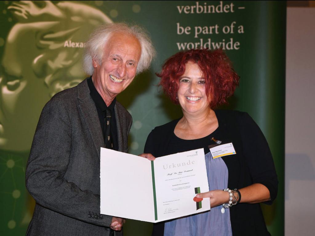 Sociolinguist Prof Ana Deumert receives the laudation for her Humboldt Research Award from Professor Helmut Schwarz, president of the Alexander von Humboldt Foundation, in Berlin.