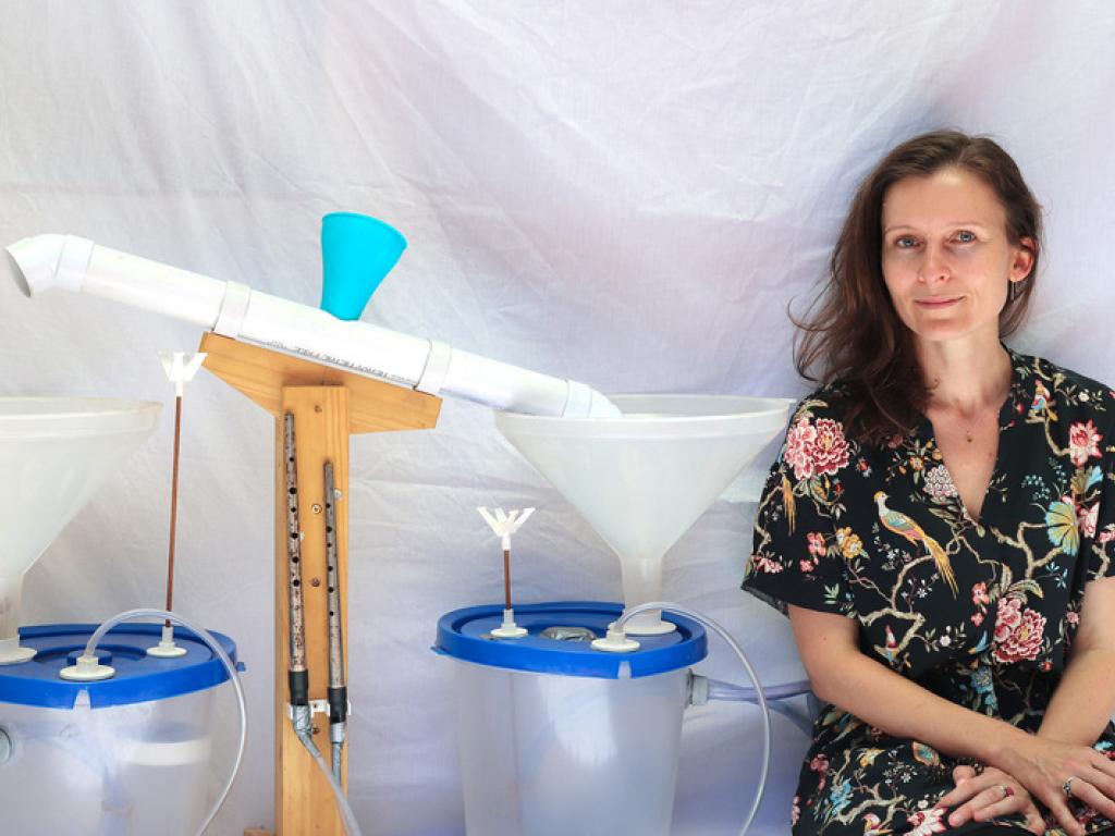 Dr Cara Stacey with her recreated rendition of medieval Islamic polymath al-Jazari’s perpetual flute, one of four designs among the 100 detailed in his text.