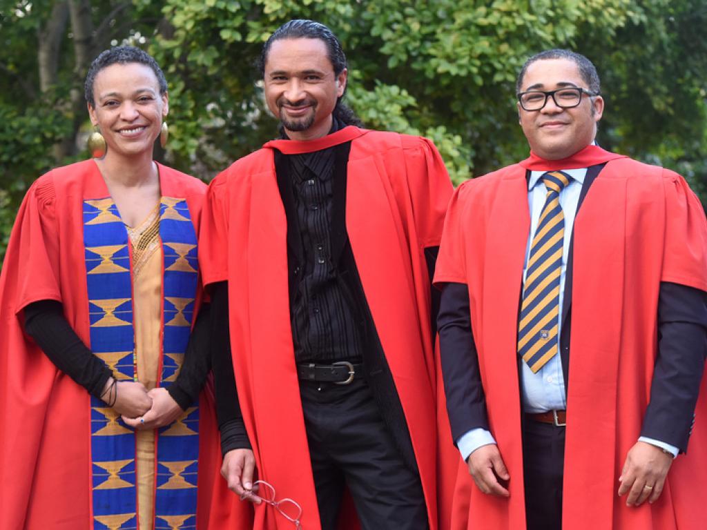 Prof Adam Haupt is flanked by Dr Shose Kessi, who introduced the activist-academic, and the University of the Western Cape’s Dr Quentin Williams, who delivered the vote of thanks.