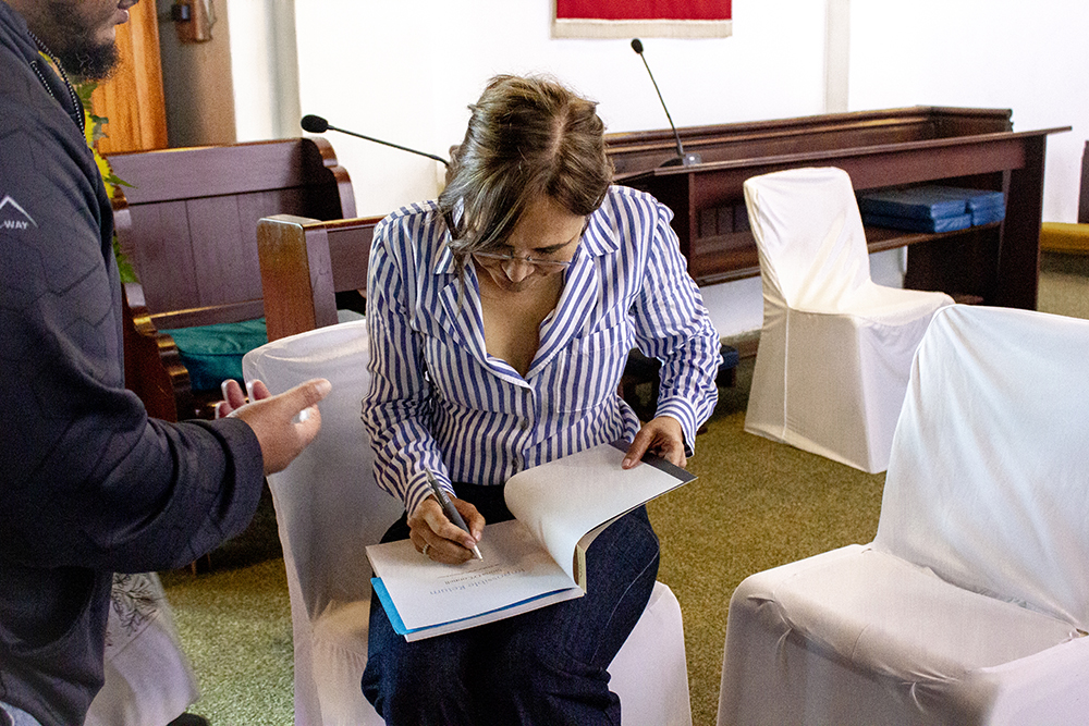 Professor Siona O'Connell signing copies of Impossible Return: Harfield Village Forced Removals.
