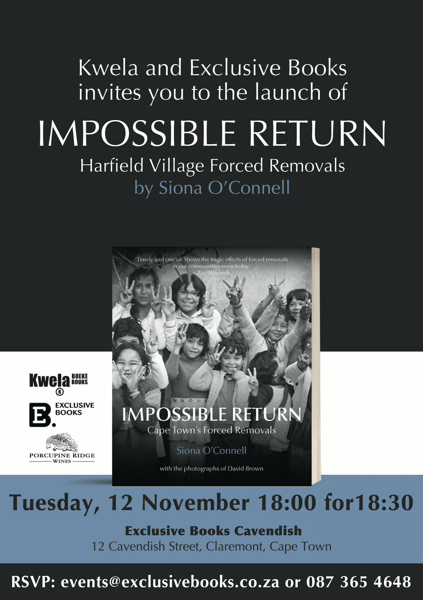 The next launch event for this book will take place on Tuesday, 12 November, at Exclusive Books, Cavendish Square, 18:00 for 18:30. Please RSVP to events@exclusivebooks.co.za