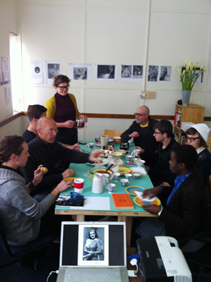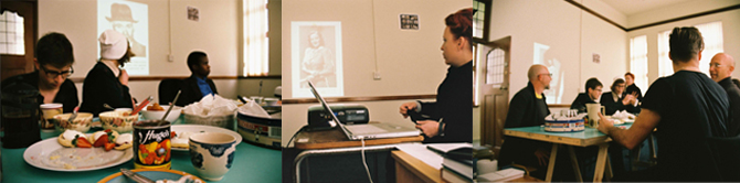 The setting: To connect the tea discussion directly with my research around the British Council-initiated Exhibition of Contemporary British Paintings and Drawings of '47 and '48 which toured all around the Union, a number of enlarged, black and white photocopies of the artworks shown and press clippings from South African newspapers at the time, were displayed in the studio. Beginning with the tenuous temporal and spatial link of Johannesburg in 1948, I wished to draw attention to other similarities between the material social inscriptions and gender politics at work in "Bubbles" Schroeder's murder case (Kathryn Smith’s research topic) and the British exhibition. Additionally, I felt that Kathryn Smith's working method would be of particular relevance to my project as well as many of my colleagues currently building or reconstituting certain "open" archives from within recent South African history. "Open" in the sense that they were never "closed cases", and Kathryn’s forensic approach specialises in picking apart the inconsistencies, gaps and overlaps within the narratives she chooses to work with. How to resolve these elements as artistic projects which operate within a socio-historical vein, is a key concern of not only my, but our work in the Centre for Curating the Archive.