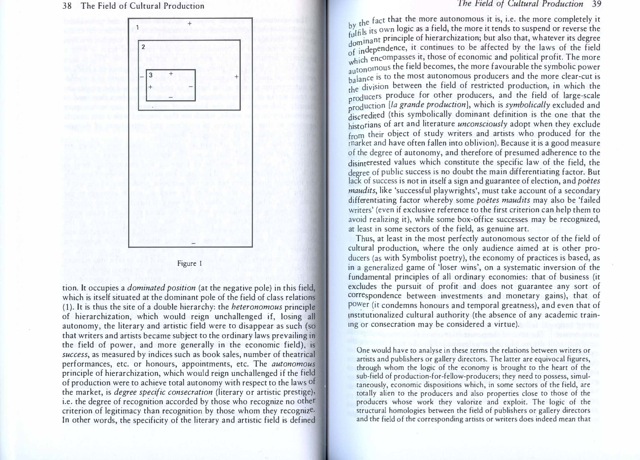 [1]Randal Johnson, "Editor’s Introduction: Pierre Bourdieu on Art, Literature and Culture," in The Field of Cultural Production: Essays on Art and Literature, Pierre Bourdieu, (ed.) Randal Johnson (London: Blackwell, 1993).