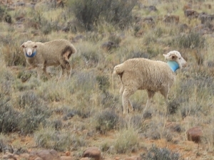 Sheep with collars to protect against predation (the sheep in the background was previously injured by a jackal).