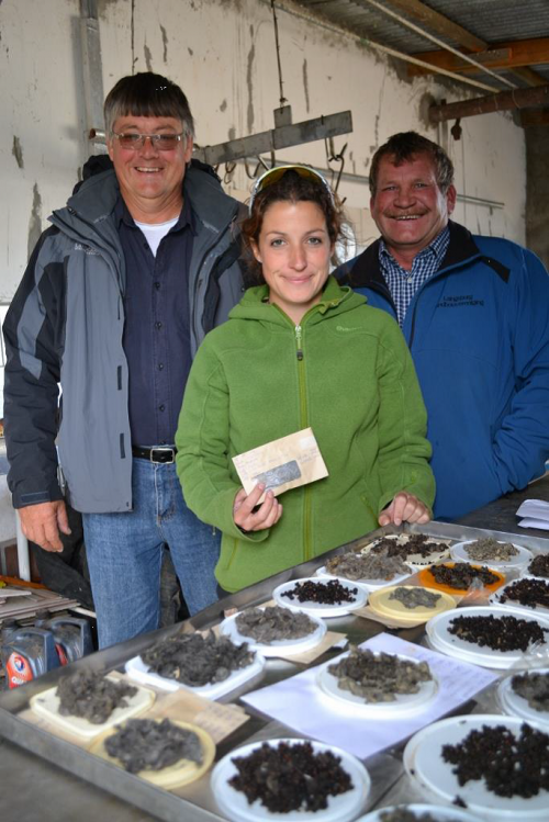 Marine Drouilly with predator scat and two farmers (Lukas Botes and Piet Gouws) who have been very supportive of the research.