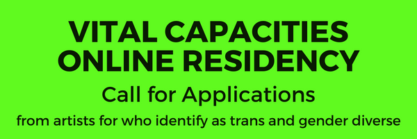 Following last year’s very successful programme, the Institute for Creative Arts (ICA) is looking for artists interested in applying for this year’s Vital Capacities online residency programme. The aim of this year’s residency is to support artists who identify as trans and gender diverse. In using the terms ‘trans’ or ‘transgender’ we include all people who identify their gender as different to the sex that was originally assigned at birth, whether this is female, male, non-binary or another identity.